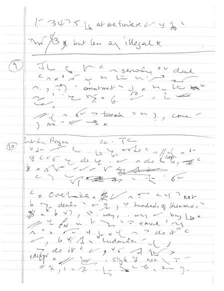 My boss’ former secretary recently came over for a “visit” (word used lightly, as she spent half her time filing papers and the other half driving me absolutely crazy) and occasionally took dictation –– in SHORTHAND –– in the evenings. Here’s what shorthand, for those of us under the age of, um, sixty looks like: