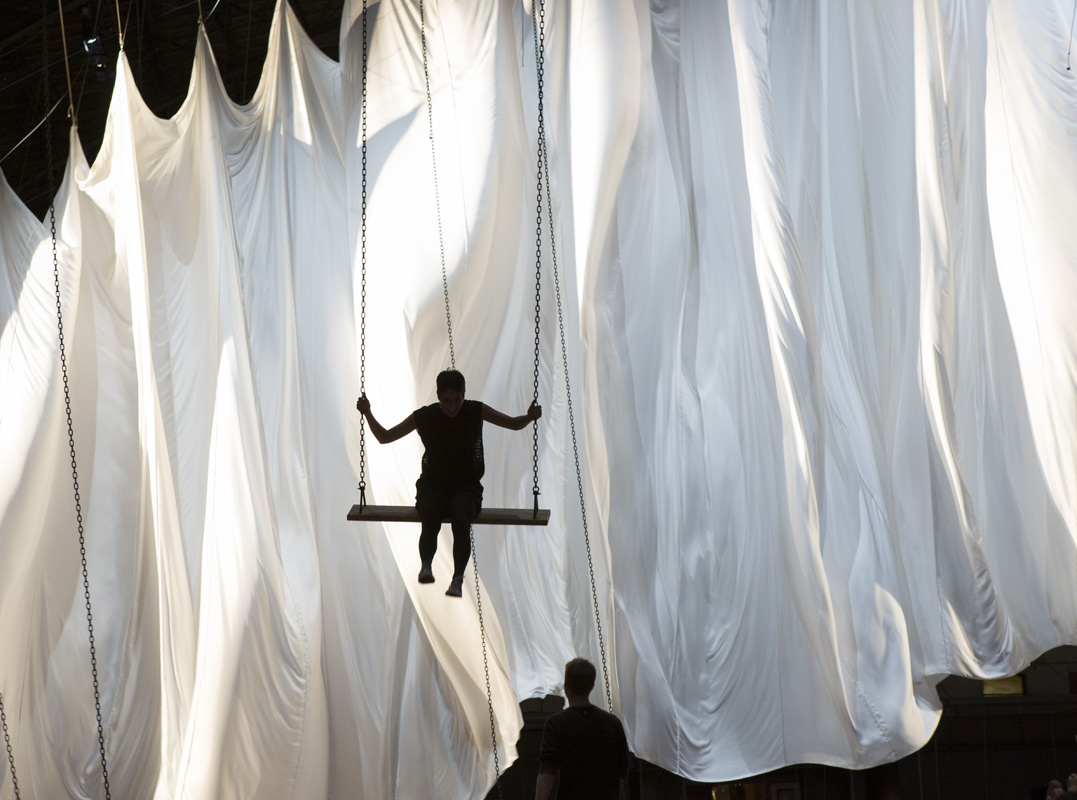 “Visual artist Ann Hamilton combines the ephemeral presence of time with the material tactility for which she is best known to create a new large-scale installation for the Wade Thompson Drill Hall. Commissioned by the Armory, the event of a thread references the building’s architecture, as well as the individual encounters and congregational gatherings that have animated its rich social history. A multisensory affair, the work draws together readings, sound, and live events within a field of swings that together invite visitors to connect to the action of each other and the work itself, illuminating the experience of the singular and collective body, the relationship between the animal and the human. The address of the readers to the pigeons shifts at the end of each day, when a vocalist on the drill hall’s balcony serenades their release to flight. Each day’s song is cut with a record lathe, and the resulting recording is played back the next day.”