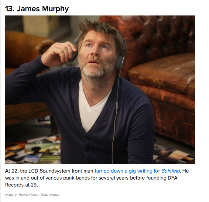 See now, they’re saying he had a tough time because he bounced around punk bands but a) he also had an enormous opportunity at 22, which would have provided an ego boost on which to coast for at least a little while, whereas a lot of the rest of us do naught but contemplate suicide or religious service for five-ten yeras and b) he founded DFA Records at 29, which technically is still a part of one’s twenties. The biggest annoyance here is that HE WAS OFFERED A JOB WRITING FOR SEINFELD AT 22! That’s not exactly a “rough time,” regardless of whether or not you accept the job.