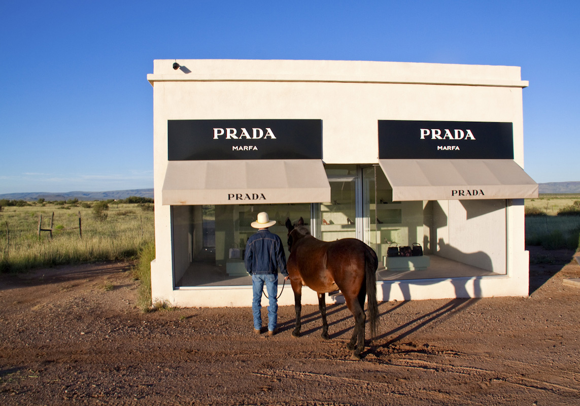 Calling all community activists: you have probably heard that our beloved Prada outpost in the Chihuahuan Desert near Marfa, Texas, has come under fire recently, probably from the same Texan morons who want to micromanage your fetus and fuck a horse (simultaneously.) I don’t particularly care about the nuances of public advertising law, but I do care about DAMN FUNNY ART, and so I am leading a group of serious people down to Marfa THIS SUNDAY via private jet to camp next to the store and protest not just its possible removal, but anything critical that anyone would ever say about it. You should definitely bring your wackiest outfits, tents and/or teepees, whisky, peace pipes, books, and musical instruments. Also, it will be helpful to have chainsaws and other tools, as we will send out small groups during the night to systematically destroy “Playboy Marfa.” We will make signs that read “I ❤ ELMGREEN AND DRAGSET” large enough to be read by helicopters flying above. Prepare to act as dead weight when the police arrive, and scare roaming cowboys by making out with the nearest person to you of the same gender.